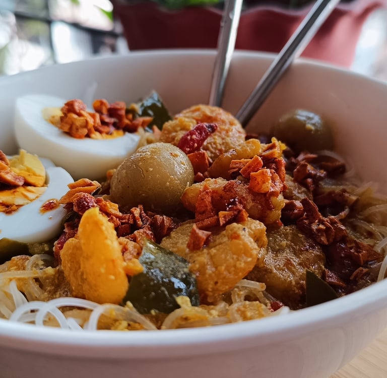 Place the noodles in a bowl, pour over the hot curry, and stir gently to coat every strand.Top It Off